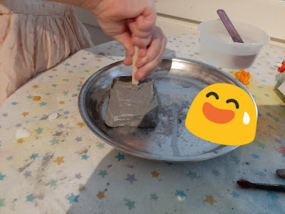My daughter finds that putting water on the mound of clay helps her chisel away. Her activity table is usually separate from our dinner table (it actually used to be our breakfast nook area).